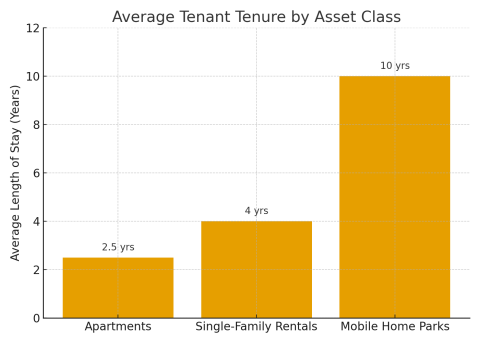 The numbers tell the story clearly. Apartments typically see residents stay two to three years, with turnover costing between $1,500 and $2,500 per unit. Single-family rentals average three to five years, with turnover costs of $2,000 to $3,500 per home. Mobile home parks, however, average ten years or more with essentially zero turnover costs to owners. On the expense side, apartments typically run at 35 to 45 percent of gross income, single-family rentals at 30 to 40 percent, and mobile home parks at a leaner 20 to 30 percent.