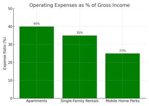 The numbers tell the story clearly. Apartments typically see residents stay two to three years, with turnover costing between $1,500 and $2,500 per unit. Single-family rentals average three to five years, with turnover costs of $2,000 to $3,500 per home. Mobile home parks, however, average ten years or more with essentially zero turnover costs to owners. On the expense side, apartments typically run at 35 to 45 percent of gross income, single-family rentals at 30 to 40 percent, and mobile home parks at a leaner 20 to 30 percent.